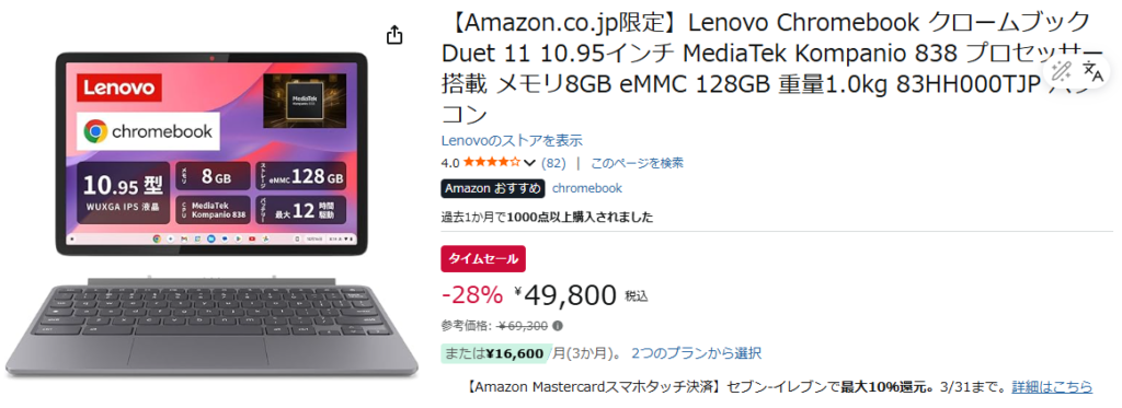 (2)49,800円|Lenovo Chromebook Duet 11|28%OFFで約2万円引き、過去1カ月で1,000点以上の大人気モデル