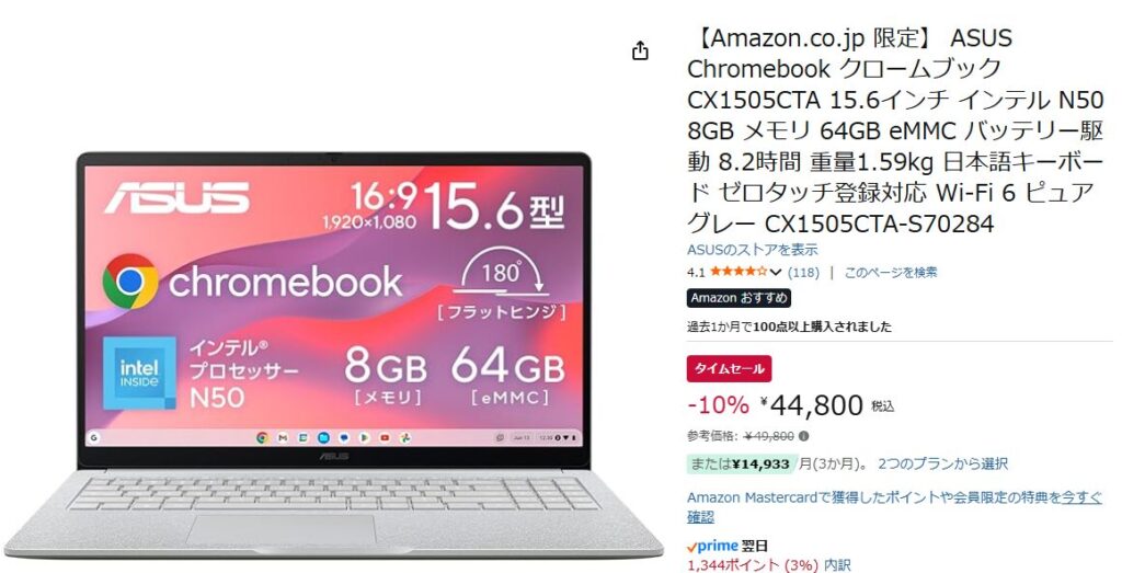 Amazon限定の15.6インチChromebookがタイムセールで44,800円になっています。参考価格49,800円からの5,000円OFFです。