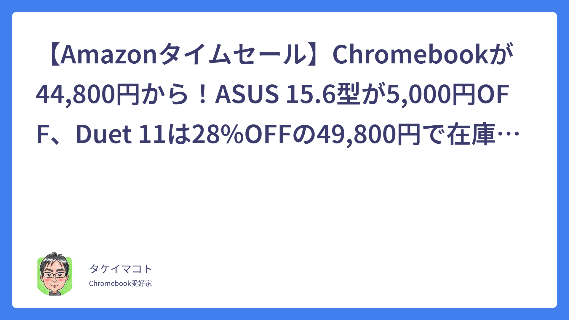 【Amazonタイムセール】Chromebookが44,800円から!ASUS 15.6型が5,000円OFF、Duet 11は28%OFFの49,800円で在庫わずか