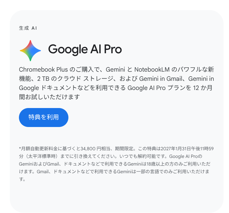 Chromebookユーザーにとって嬉しいのが、Google AI Proの無料特典です。
