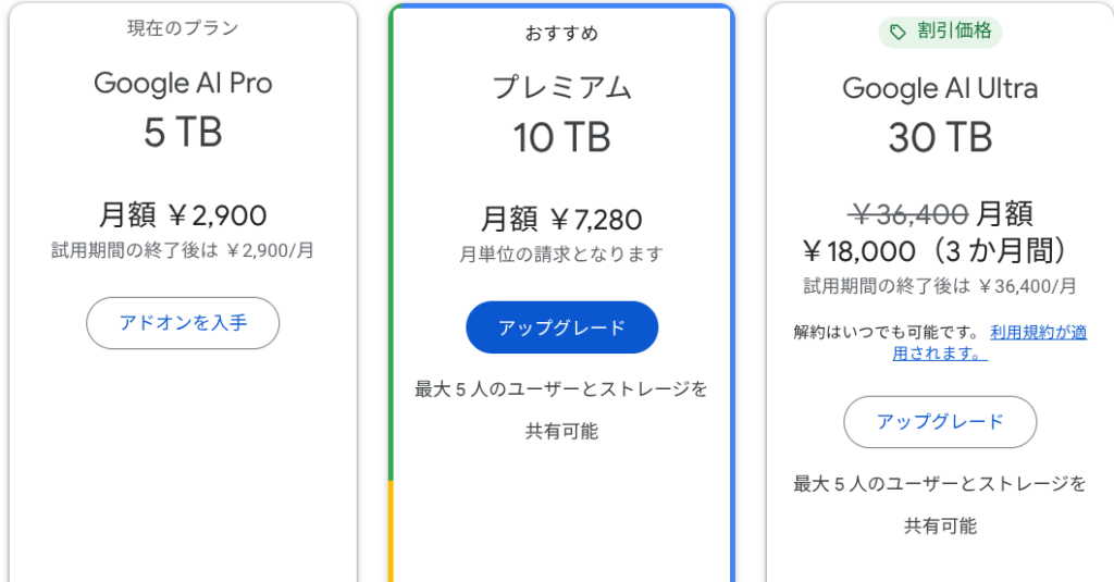 | Google AI Ultra | 30TB | 18,000円〜 |