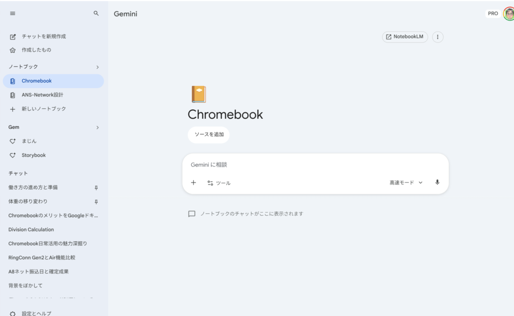 Geminiのサイドバーに「ノートブック」というセクションが追加され、ここからNotebookLMのノートブックを直接作成・参照できるようになっています。