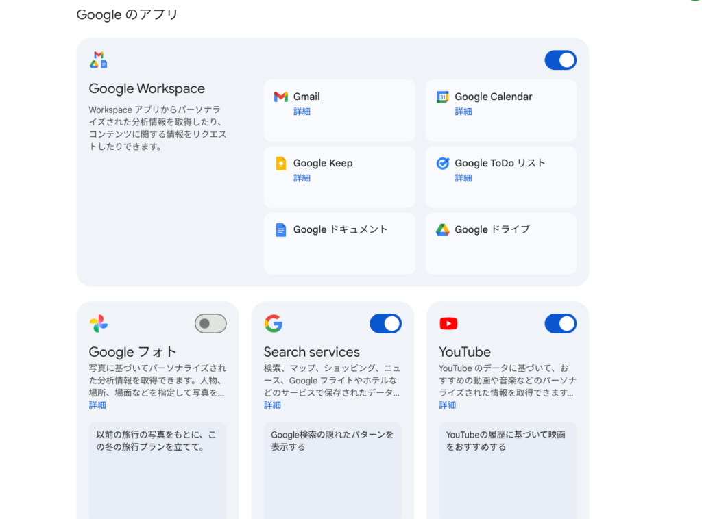 私は、Googleフォト以外はパーソナルインテリジェンスをオンにしました。写真はプライベートなものが多いので、ここはちょっと慎重にいきたいところです。