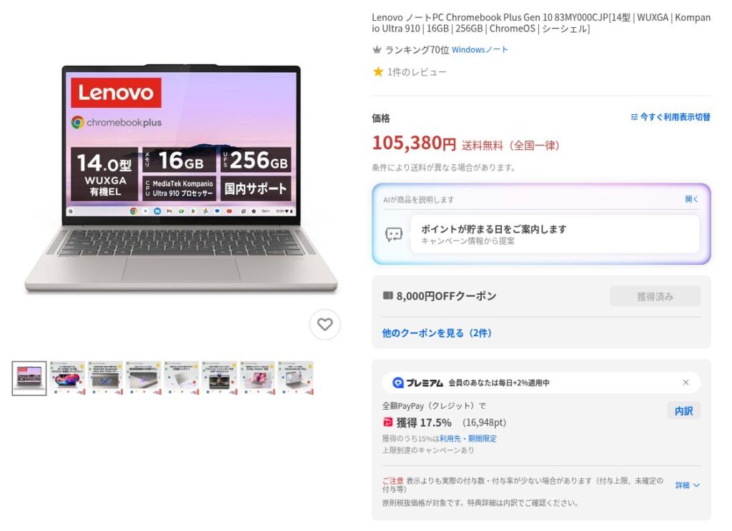 YahooショッピングでLenovo Chromebook Plus Gen 10がかなりお得になっています。