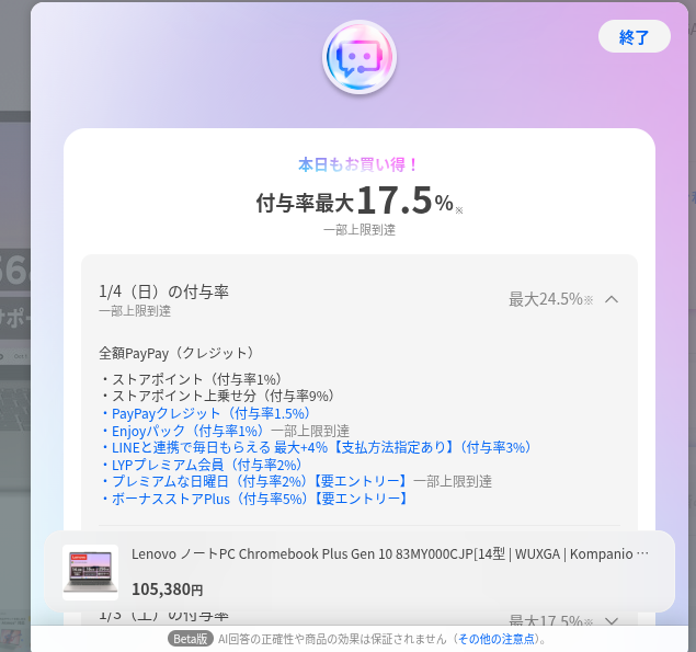 1/4は「プレミアムな日曜日(+4%)」や「ボーナスストアPlus(+5%)」が重なるため、現在より7%もポイントアップする可能性があります。