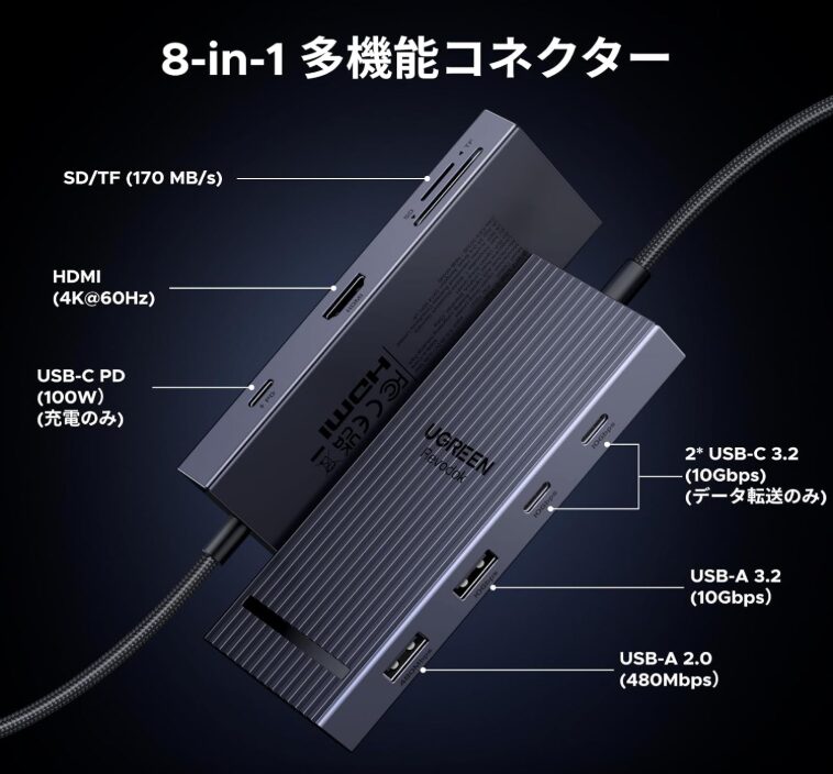 8in1でPD対応、HDMI搭載、SDカードスロット付き、しかも信頼できるメーカーの製品となると、だいたい4,000円〜5,000円はしますよね。Ankerなど他メーカーも比較しましたが、3,000円以下だったのはUGREENだけでした。