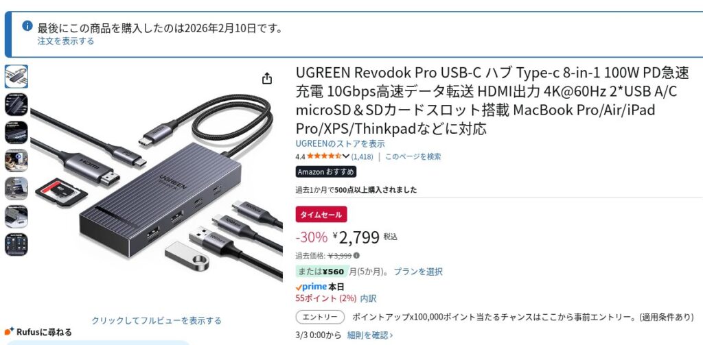 一つだけ注意点を挙げるなら、購入タイミングです。通常価格だと約4,000円程度になるので、30%オフなどのセール期間に買うのが賢いです。UGREENは比較的頻繁にタイムセールをやっているので、Amazonのほしいものリストに入れておいて価格をウォッチしておくといいですよ。